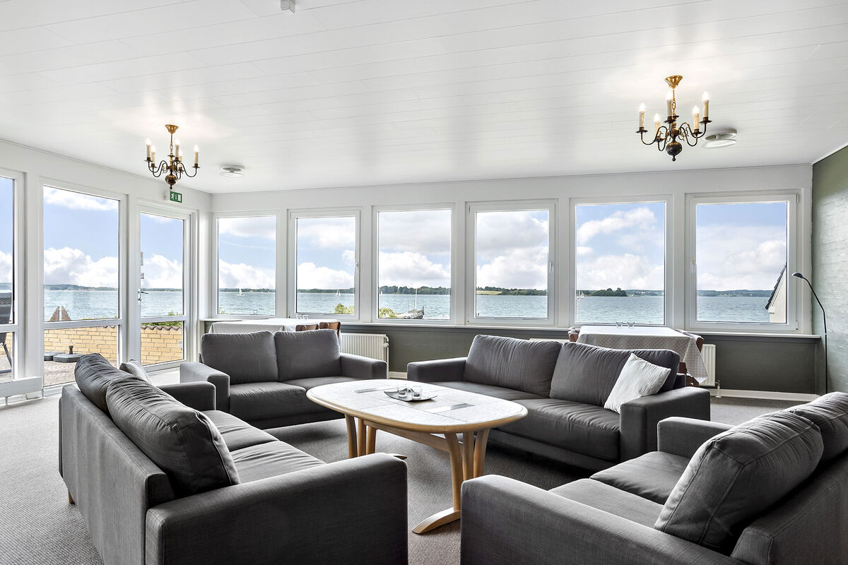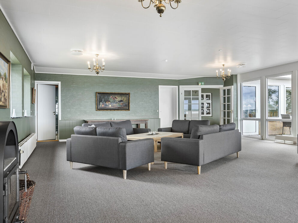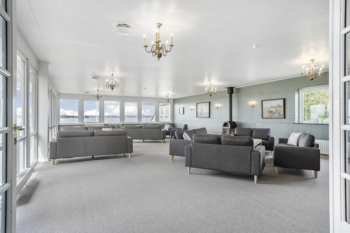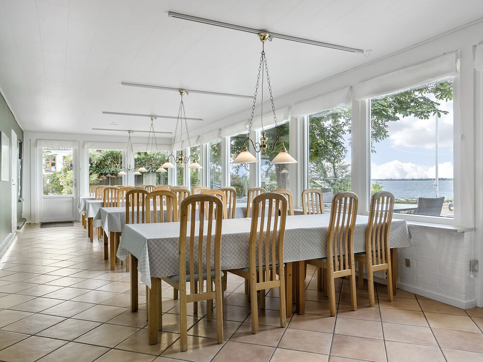 Das Gebäude erstreckt sich über 2 Etagen. Das Erdgeschoss beinhaltet eine einladende Poolabteilung mit einem 40 m² großen Swimmingpool inklusive einer Gegenstromanlage, einem großen Whirlpool, einer Duschnische und einem Zugang zur Sauna. Hinzu gesellt sich ein großer, gemütlicher Aufenthaltsraum mit mehreren Sofagruppen, einem Fernseher, einem Kaminofen und großen Panoramafenstern, die Ihnen einen offenen Blick auf das Wasser gewähren. Von diesem Raum aus gelangen Sie in das separate Esszimmer mit ausreichend Platz für bis zu 32 Personen, das ebenfalls mit einer Fensterpartie in Richtung Wasser glänzt und Sie während Ihres Essens mit traumhaft schönen Ausblicken verwöhnt. Ihnen stehen außerdem eine funktionelle und geräumige Industrieküche für die Zubereitung des Essen für bis zu 32 Personen, sowie ein 5 m² großer Kühlraum zur Verfügung.