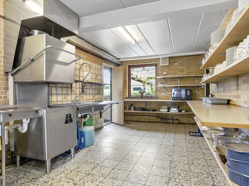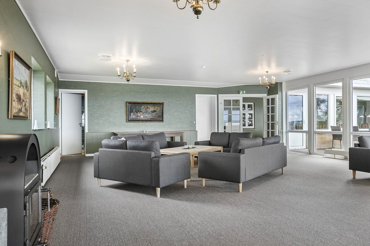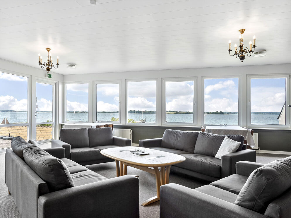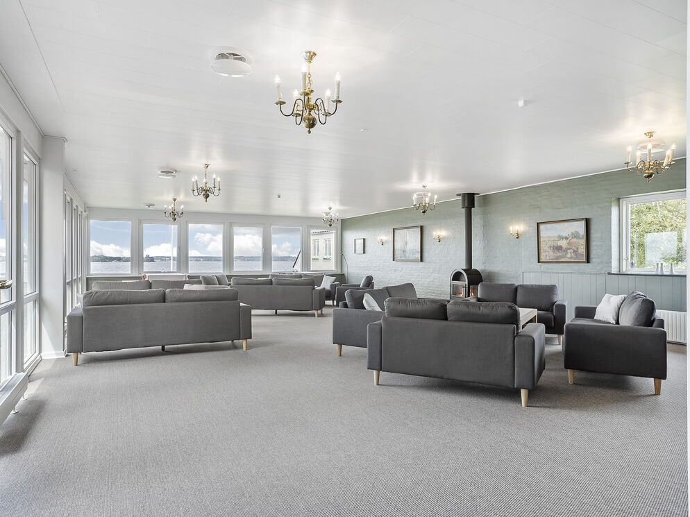 Das Gebäude erstreckt sich über 2 Etagen. Das Erdgeschoss beinhaltet eine einladende Poolabteilung mit einem 40 m² großen Swimmingpool inklusive einer Gegenstromanlage, einem großen Whirlpool, einer Duschnische und einem Zugang zur Sauna. Hinzu gesellt sich ein großer, gemütlicher Aufenthaltsraum mit mehreren Sofagruppen, einem Fernseher, einem Kaminofen und großen Panoramafenstern, die Ihnen einen offenen Blick auf das Wasser gewähren. Von diesem Raum aus gelangen Sie in das separate Esszimmer mit ausreichend Platz für bis zu 32 Personen, das ebenfalls mit einer Fensterpartie in Richtung Wasser glänzt und Sie während Ihres Essens mit traumhaft schönen Ausblicken verwöhnt. Ihnen stehen außerdem eine funktionelle und geräumige Industrieküche für die Zubereitung des Essen für bis zu 32 Personen, sowie ein 5 m² großer Kühlraum zur Verfügung.