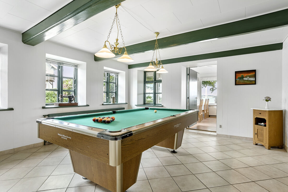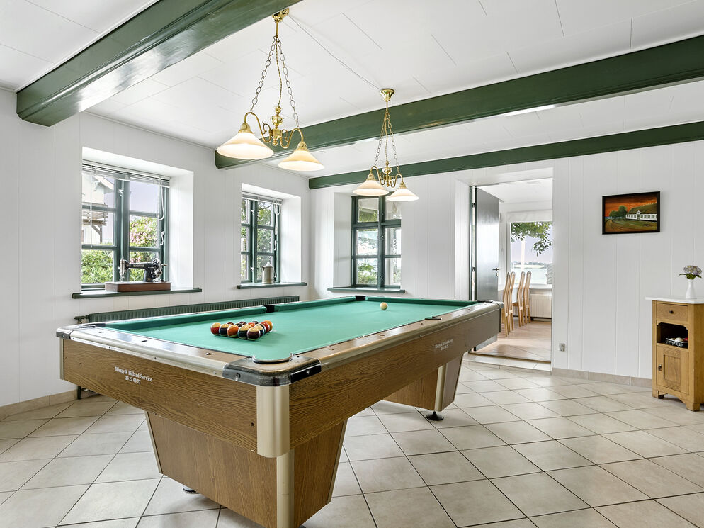 Der Aktivitätsraum des ehemaligen Landgasthofs lockt mit unzähligen Aktivitätsmöglichkeiten und Trainingsgeräten. Vom Wohnraum aus gelangen Sie zudem direkt hinaus auf eine 150 m² große Aussichtsterrasse, auf der Sie mit einem Blick über den Garten und das Wasser verwöhnt werden. Von der Küche aus haben Sie Zugang zu einer überdachten Terrasse. Schöne Aufenthaltsmöglichkeiten bietet Ihnen außerdem das 5.500 m² große Grundstück, das sich ganz bis hinunter an die Flensburger Förde und an deren kinderfreundlichen Badestrand erstreckt.