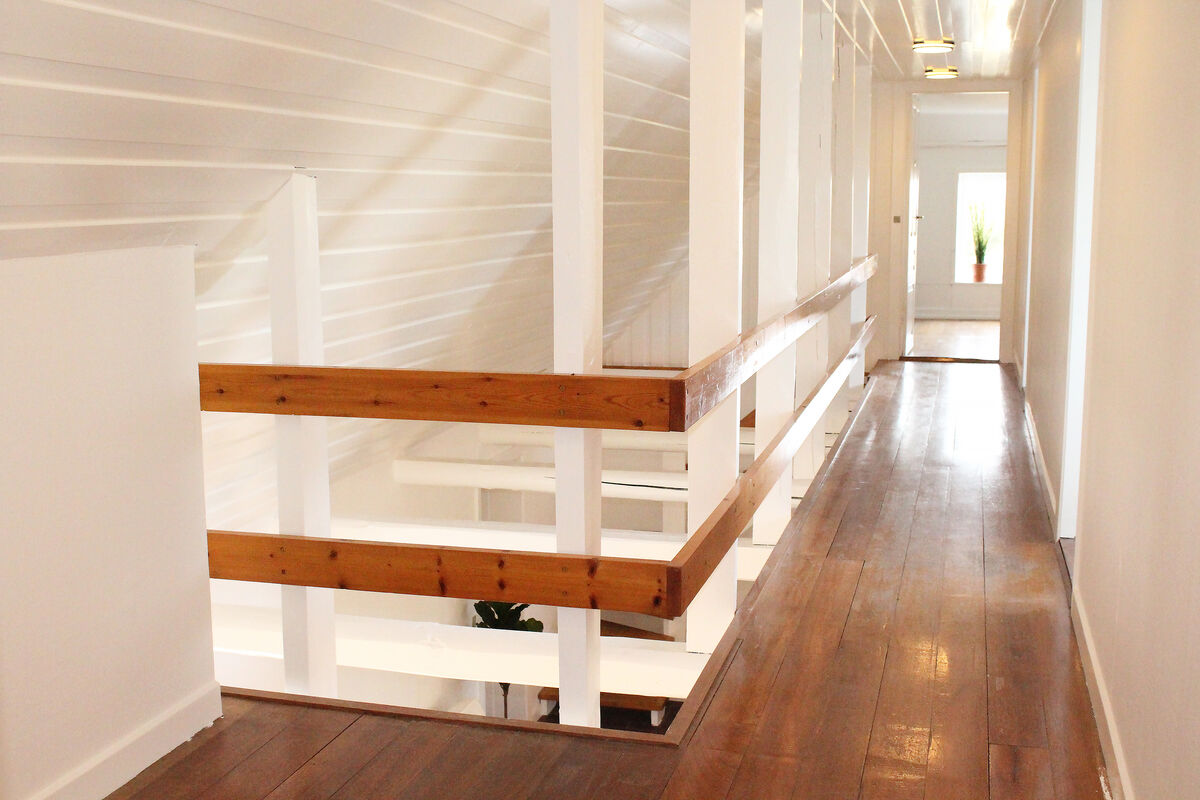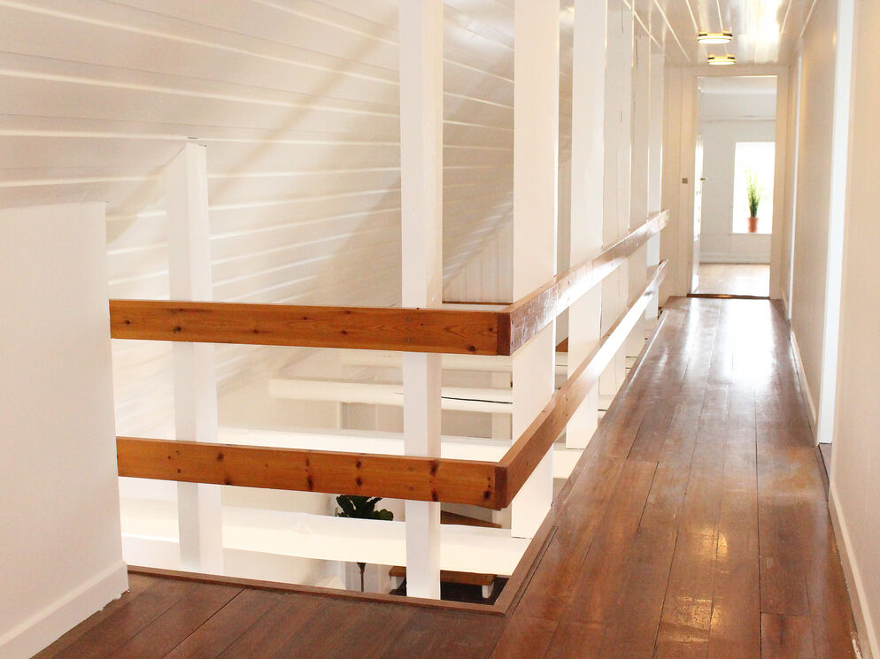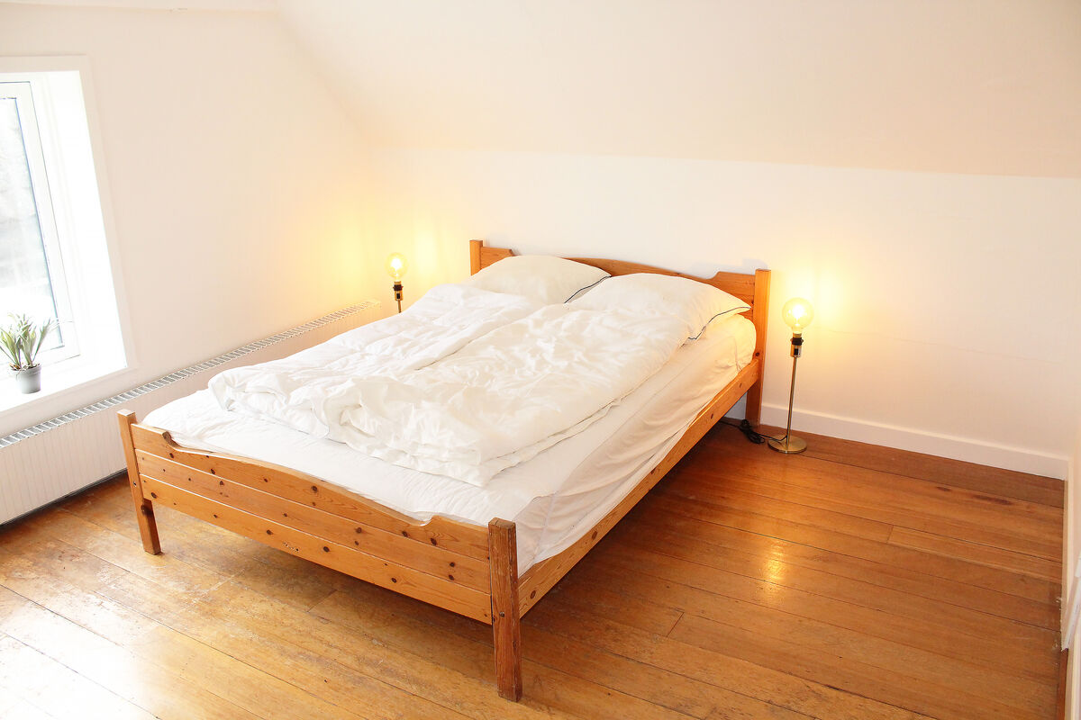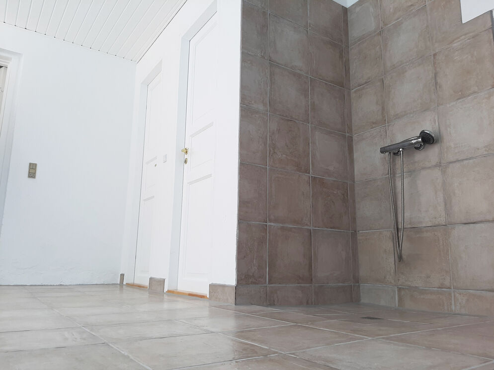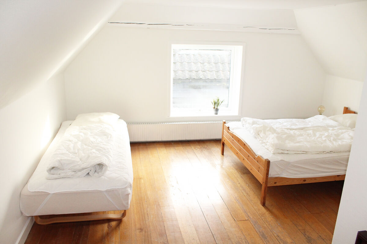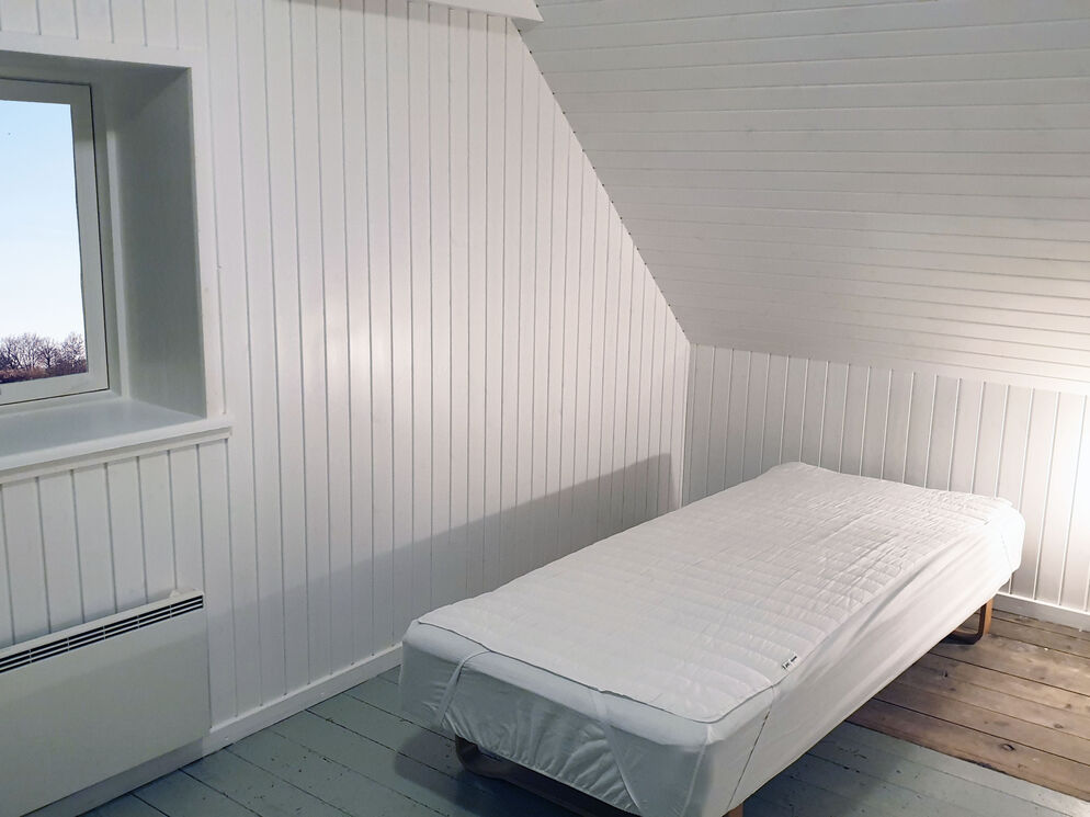 Das Erdgeschoss beherbergt darüber hinaus auch den großen Küchen- und Essbereich, in dem Sie im Kreise Ihrer Lieben die Mahlzeiten zubereiten, gemeinsam essen und vergnügliche Brettspiele an den großen Esstischen spielen können. Vier Badezimmer mit Fliesenböden und drei Schlafräume sind ebenfalls im Erdgeschoss platziert. Vom Wohnraum führt Sie eine Treppe in das obere Stockwerk, das mit weiteren vier Schlafräumen und einem langen Flur mit Blick hinunter auf den Kaminbereich besticht. Vom Küchen- und Essbereich führt eine weitere Treppe in das Obergeschoss. In diesem Bereich des ersten Stockes treffen Sie auf zwei Schlafräume, die Sie mit einem herrlichen Ausblick über die Landschaft und das Meer in der Ferne verwöhnen. Das von Feldern umgebene Ferienhaus liegt in ruhiger, idyllischer Umgebung, nur 500 Meter von einem schönen Strand entfernt.