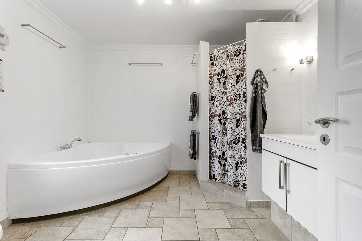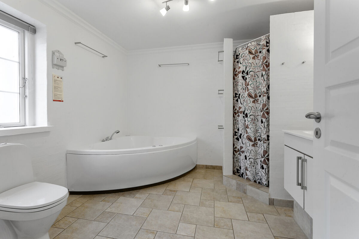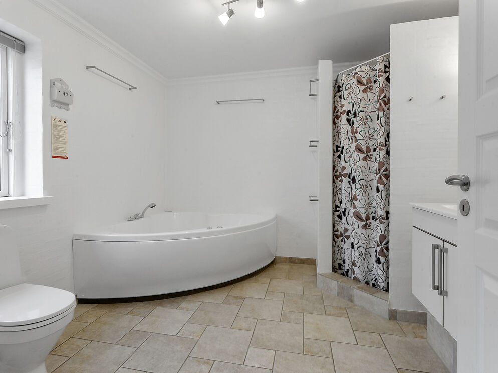 Beautiful holiday home of 475 m2 with a large swimming pool of 27 m2, featuring separate changing rooms for men and women, each with two showers, and a guest toilet with a changing table. Additionally, there is a sauna and a large activity room with both a pool table and table tennis. Furthermore, there are two large living rooms, two kitchen-dining areas, two bathrooms with a spa, and an additional two bathrooms on the first floor. The house also includes eight bedrooms and a 49 m2 conservatory. The property is located near the holiday home area of Vejlby Fed. The accommodation is designed for 17 people. The property includes a lovely large enclosed garden with multiple terraces, a playground, a sports field, and a bonfire area. Electric cars can be charged at the campsite's charging stations, which are for shared use throughout the area.