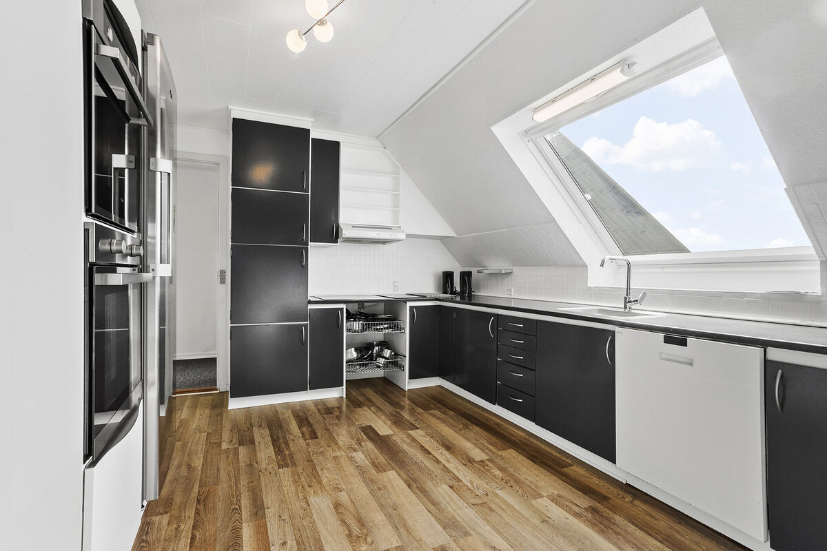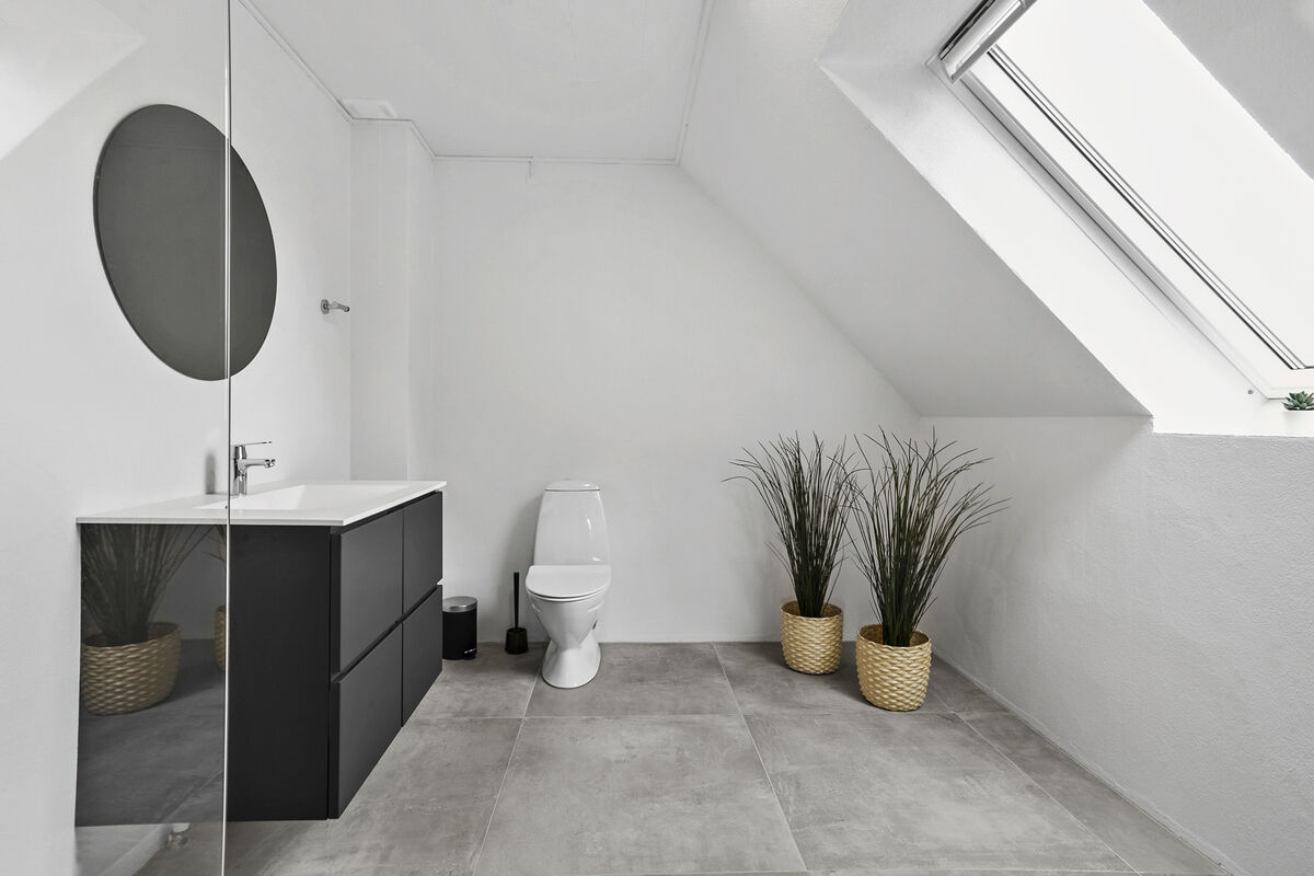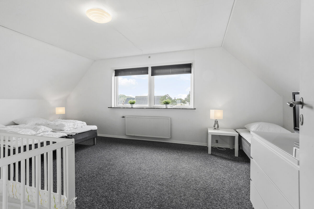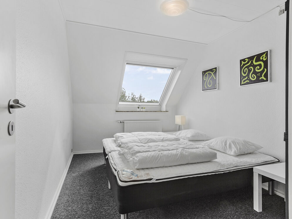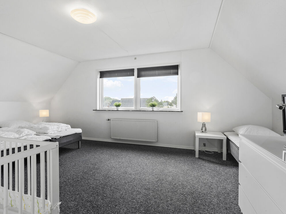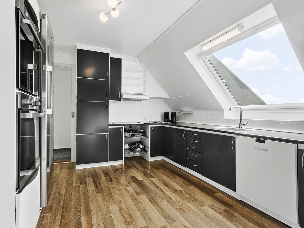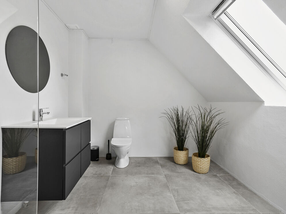 From the staircase, you directly enter the house's large living room with a sofa arrangement and dining table. From here, you will also find a gorgeous view of the water. There is a well-equipped kitchen and a bathroom with a beautiful shower cabin, and an additional 3 bedrooms, one of which has a large built-in wardrobe. The plot belonging to the house consists of a terrace and a small play area.