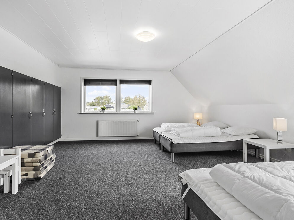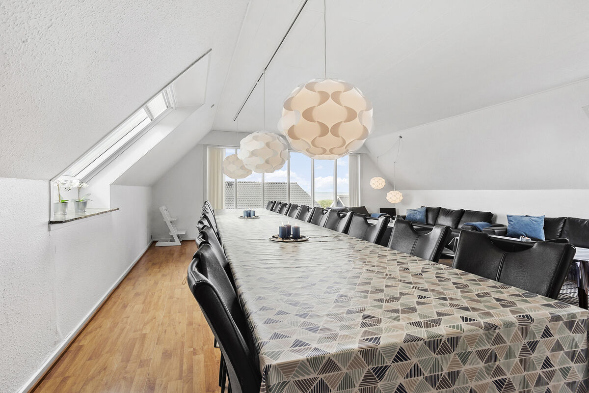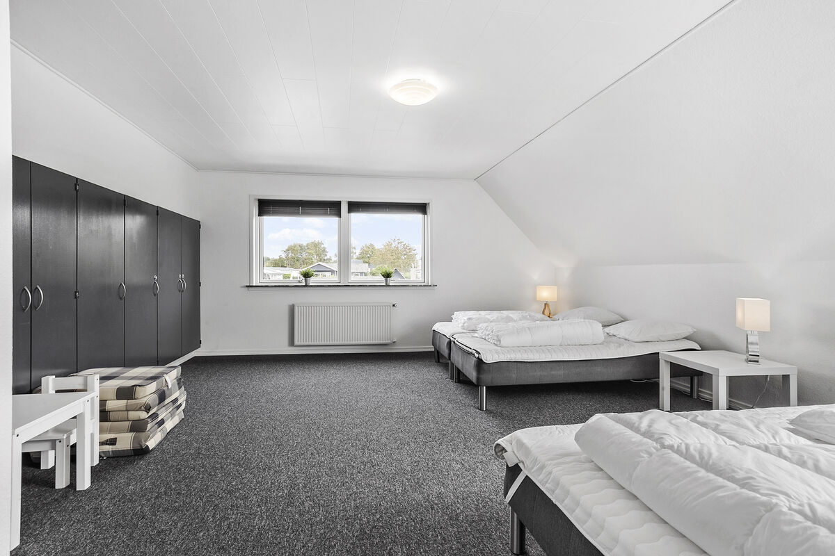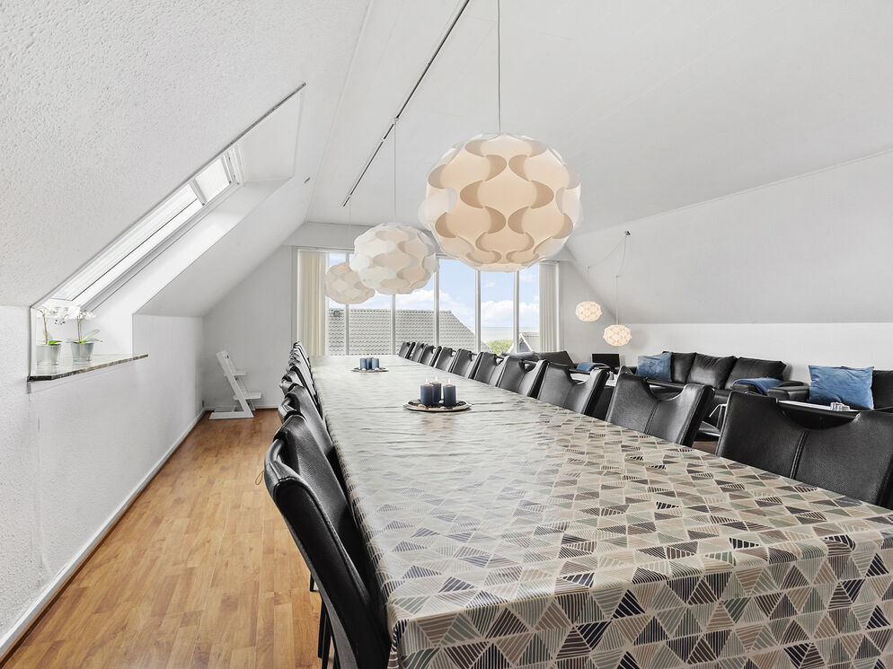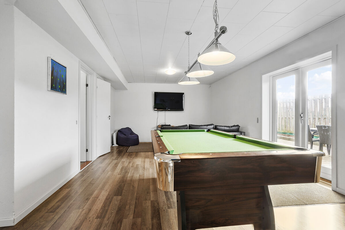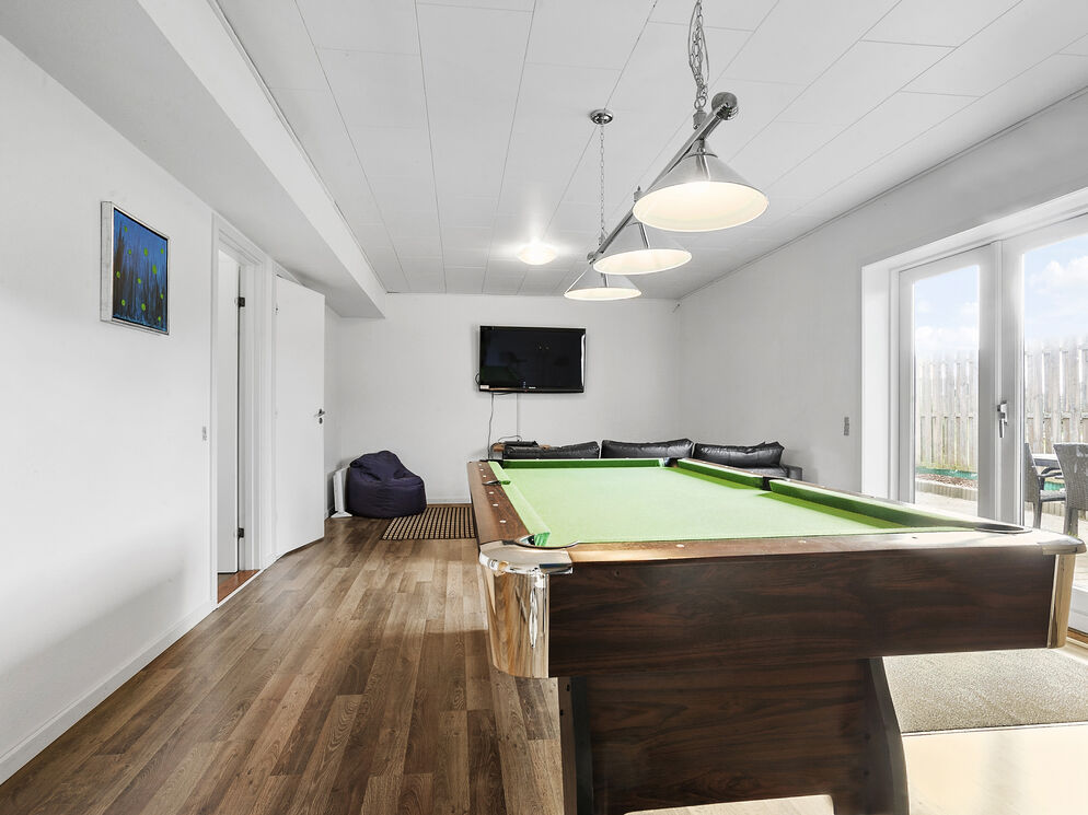 In Bro Strand, you will find this beautiful modernized home with space for 20 people and a swimming pool. The house is well situated, only 25 meters from the beach, with views of the water from the 1st floor. The house is built on 2 floors and includes, on the ground floor, a large foyer with a staircase leading to the first floor. From the foyer, there is access to 3 different bedrooms, the pool area along with the swimming pool, spa, and a bathroom with sauna. Additionally, there is a guest toilet and a small living room with a billiard/pool table. From this living room, there is access to the terrace and another bedroom.