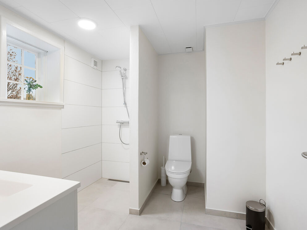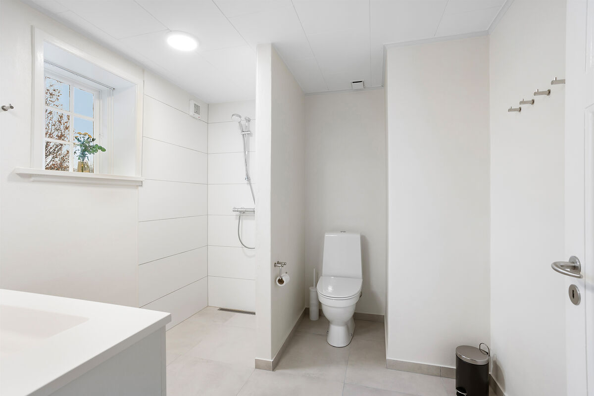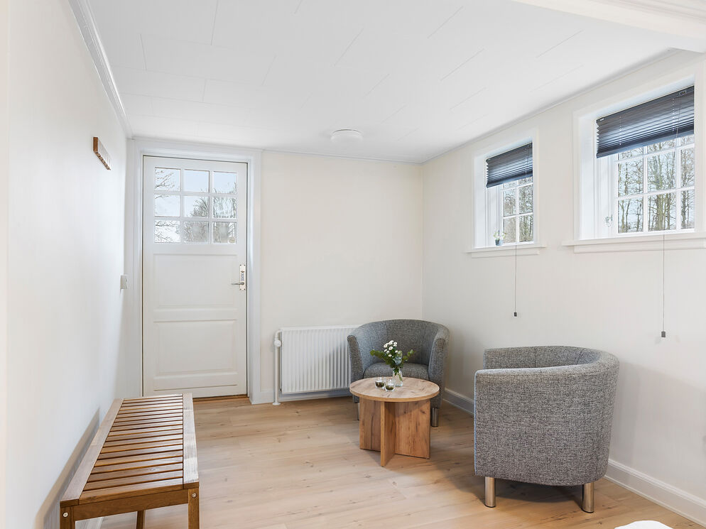 The house is furnished with a foyer, a large kitchen/living room with access to a large charming living room with visible beams and access to a cozy 1st floor/repose with a lounge area and a view over Hvidkilde Lake, as well as a snug corner with a TV/gaming area for the younger members of the family. In the living room, there is also access to 2 separate toilets.