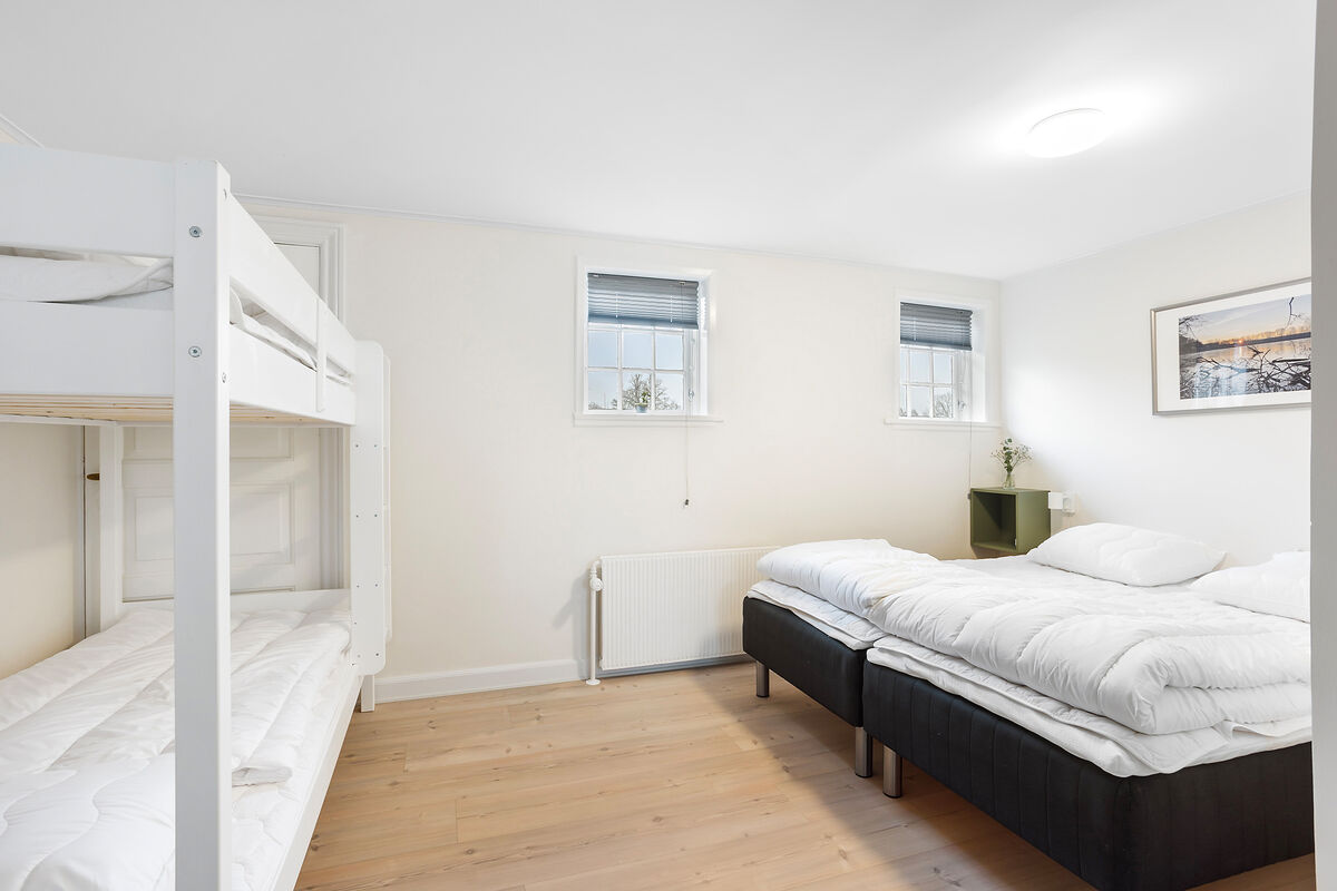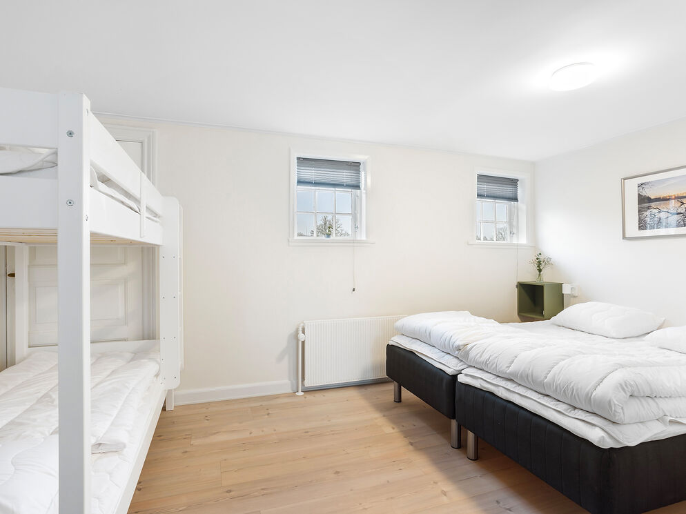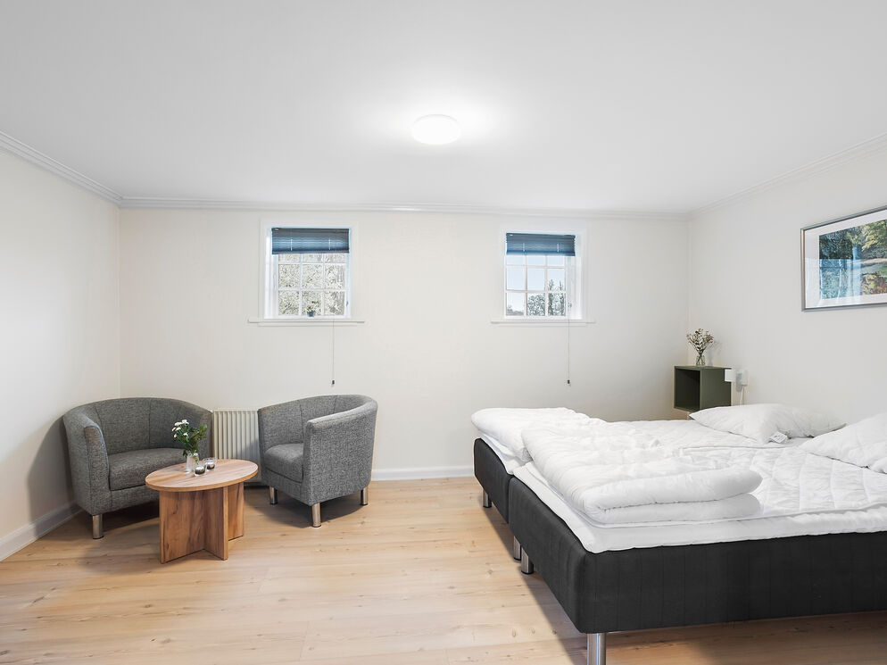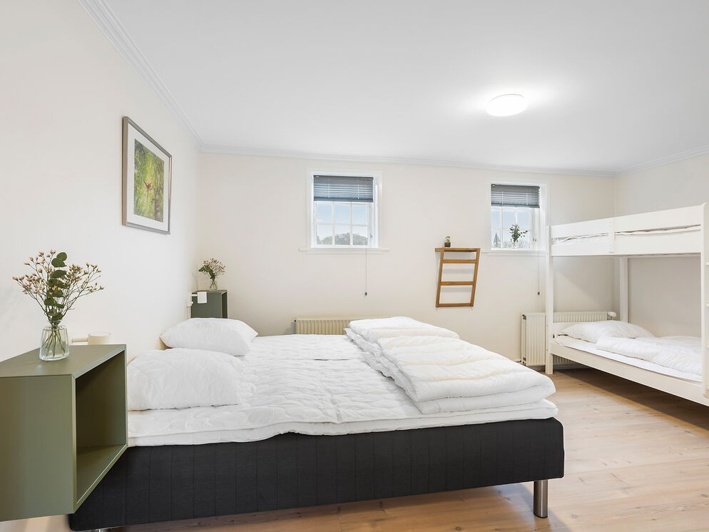 4 of the rooms are furnished with a double bed and a pull-out couch. 3 of the rooms have a double bed and a bunk bed, fitting 2 people. The remaining 2 rooms have double beds. Additionally, there are 4 good guest beds available for setup as needed. In total, there are sleeping accommodations for 36 people.
