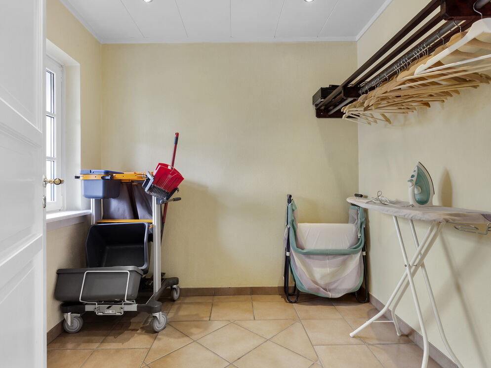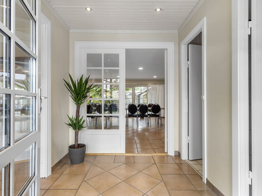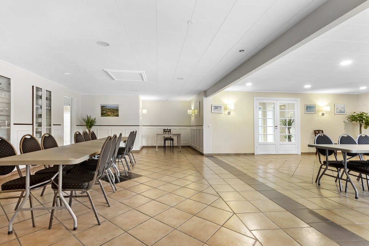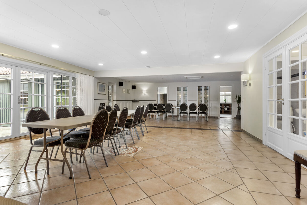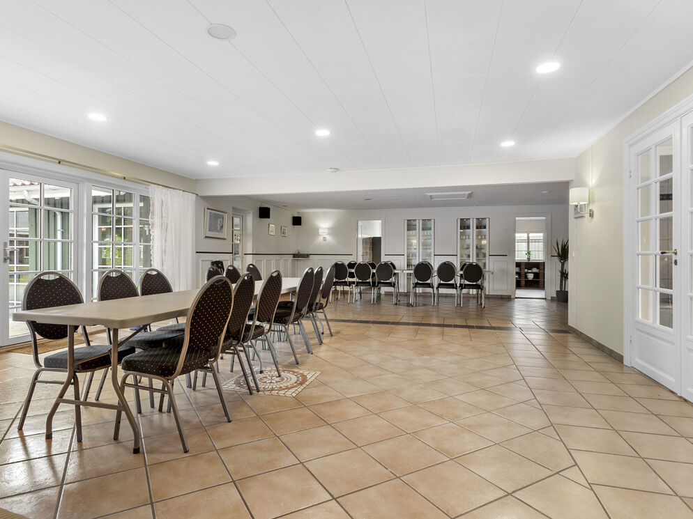 The holiday home accommodates 24 people and was partially renovated in 2013. The house includes a large, beautiful wellness area where you can space out in the 65m2 swimming pool, relax in the spa to loosen your tight muscles, and spend some time in the sauna located on the "island" in the middle of the pool. The wellness area also includes a bathroom. The living room is furnished with a large sofa arrangement and TV, as well as an area with both a pool table and table tennis. Furthermore, you will find a dining room with a table and chairs for everyone. The home has a large kitchen with plenty of space for culinary adventures. There are 12 bedrooms in the house, each with its own bathroom and toilet; 6 rooms have double beds, and 6 rooms are equipped with single beds. The property includes a large terrace with garden furniture and a grill.