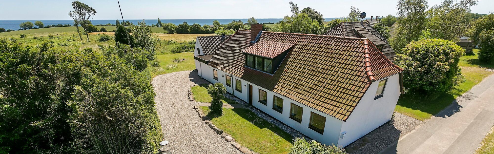 I stueetagen findes ligeledes et stort køkken-alrum med god plads til at lave mad med familie og venner, samt spise, hygge eller spille brætspil ved de store spiseborde. Der er desuden 4 badeværelser placeret i stueetagen med klinkegulve og hertil tre soverum. Fra opholdsstuen er der opgang til 1. sal, hvor der befinder sig fire af husets soverum og en lang gang med udsigt ned til pejseområdet. Fra køkken-alrummet er der adgang til yderligere en 1. sal med to tilhørende soverum, som har den smukkeste udsigt over landskabet og med havet i det fjerne. Huset ligger i rolige og idylliske omgivelser omgivet af marker og kun 500 meter fra en dejlig strand.